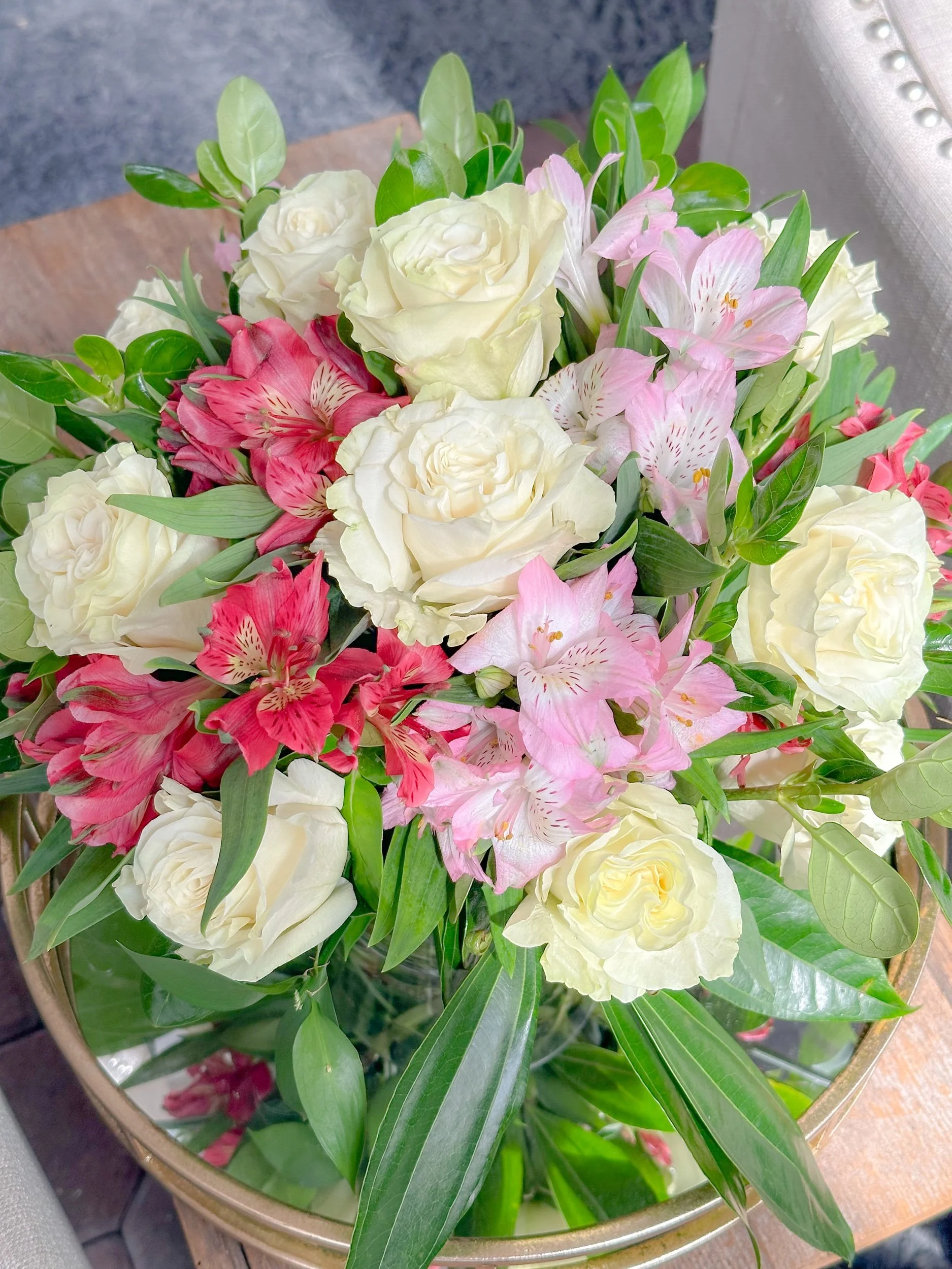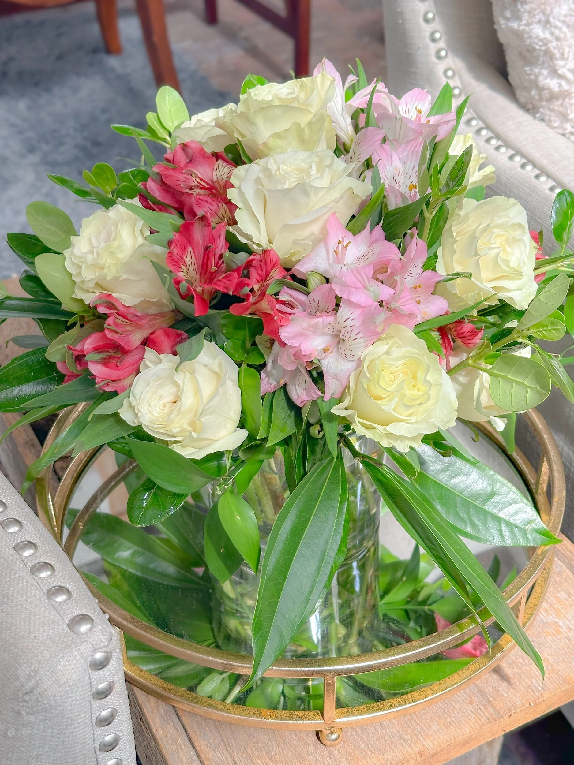 Soft, elegant, and full of fresh seasonal beauty, this handcrafted arrangement features a beautiful mix of roses, alstroemeria, and lush greenery arranged in a clear glass vase. Designed in soft whites and pinks, it makes a lovely gift for birthdays, Easter, sympathy, celebrations, or simply brightening someone’s day.
